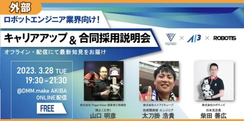 【3月28日(火)】ロボットエンジニア合同採用説明会 株式会社FingerVision・株式会社エイアイキューブ・株式会社ロボティズの3社が、ロボットエンジニア業界での転職・キャリアアップを目指す社会人・現役のロボットエンジニアを目指す方々を対象に、合同採用説明会&ロボットエンジニア交流会をDMM.make AKIBAで開催!会員の皆様も、興味のある方