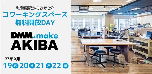 【9月入会で初月&翌月無料】9月後半コワーキングスペース無料開放デー開催! モノづくりコワーキングDMM.make AKIBAの月額プランが大幅値下げリニューアル!24時間365日利用可能。秋葉原駅から徒歩2分の好立地。月額7,700円から!🌟初月+翌月分会費無料キャンペーン中🌟体験イベント『コワーキングスペース無料開放デー』を開催いたします。 DMM.make
